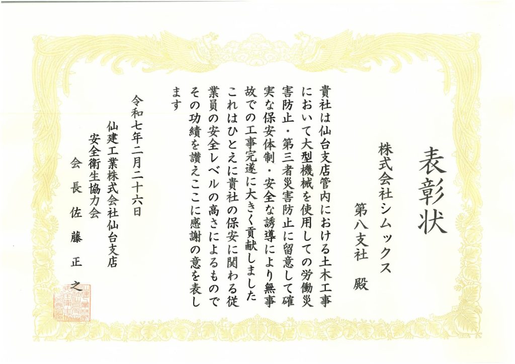 2025年(令和7年)2月26日、ホテルメトロポリタン仙台4F千代の間にて執り行われた仙建工業㈱仙台支店安全衛生協力会安全講和・新春新年会に出席し、仙台支社管内における土木工事において、労働災害防止・第三者災害防止に留意し、確実な保安体制・安全な誘導により無事故での工事完遂への貢献を評価いただき、表彰状・褒賞をいただきました。