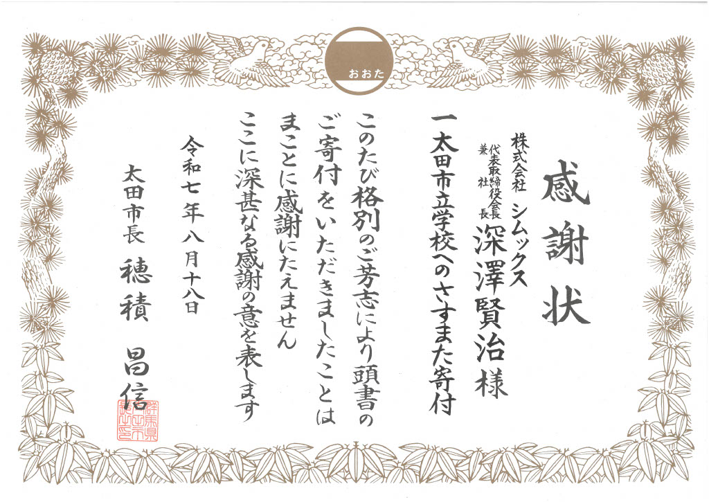 なお、各学校への配布に先立ちまして、8月18日に太田市役所にて穂積太田市長あてに目録の贈呈をさせていただき、太田市長より寄贈に対する感謝状を頂きました。